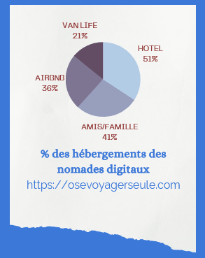 Le nomade numérique préfère se loger à l’hôtel dans 51% des cas, chez des amis ou la famille dans 41% des cas, dans un airbnb dans 36% des cas, en van life dans 21% des cas et les auberges de jeunesse dans 18% des cas.